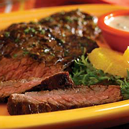 2. Mezcle el jugo de naranja restante con la crema agria y la cebolla verde. Cúbralo y refrigérelo hasta que esté listo para servirse. (Se puede refrigerar toda la noche.) 3. Retire los fletes de la marinada; deseche la marinada. Coloque los filetes en una parrilla con carbones medianos cubiertos de cenizas. Áselo cubierto de 7 a 12 minutos (a temperatura media en asador de gas precalentado cubierto, de 8 a 12 minutos) para término entre medio y crudo (63°C), con vueltas ocasionales. 4. Corte el filete en diagonal en rebanadas delgadas; sazone con sal y pimienta al gusto. Sírvalo con la salsa cítrica. * Esta receta es una fuente excelente de proteínas, vitamina B6, vitamina B12, selenio y zinc; y una buena fuente de niacina y hierro. Nutritional information: