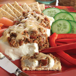 1. Remove cream cheese from foil wrapper; place on microwaveable serving plate. Mix bacon and mustard; spread over cream cheese. Sprinkle with mozzarella cheese.