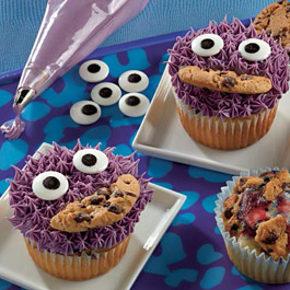 2. Cut 12 cookies in half; reserve for later use. Coarsely chop remaining cookies. 3. Prepare cake batter as directed on package; spoon into 24 paper-lined muffin cups. Add 1 drop EACH blue and red food coloring to batter in each cup; swirl gently with knife. Top with chopped cookies; press gently into batter to secure. 4. Bake 18 to 21 min. or until toothpick inserted in centers comes out clean. Cool 5 min. Remove cupcakes from pan to wire racks; cool completely. 5. Spoon frosting into medium bowl. Add 24 drops red food coloring and 16 drops blue food coloring; mix well. Spoon into pastry bag fitted with star tip. Use to pipe frosting onto tops of cupcakes. 6. Garnish with reserved cookie halves and candy eyes. Refrigerate 1 hour. Food Facts: You will need about 1/2 tsp. EACH red and blue food coloring, and 2 pkg. (1 oz. each) candy button eyes to prepare and decorate the 24 cupcakes. Nutritional information: